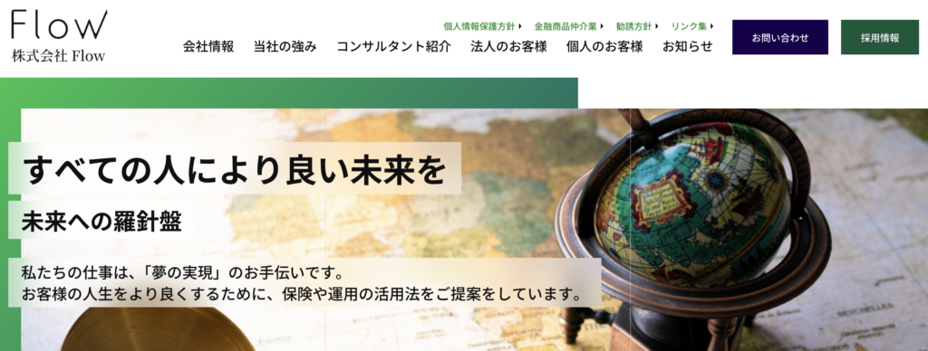 株式会社Flowは、乗合保険代理店と金融商品仲介業の兼業です。担当のフィナンシャルナビゲーターは生保・損保・資産運用の3分野をワンストップで相談可能。お客様のご意向を伺い、年齢・収入・資産・家族構成やお客様の将来の『夢』などのライフプランを踏まえ、資産を「増やす運用」と「守る保険」を組み合わせて提案し、夢の実現のお手伝いをしていきます。創業から31年(2025年時点)を経て、死亡・交通事故・火災などの保険金支払い経験や、バブル崩壊・リーマンショック・コロナなどの暴落局面を乗り越えた運用経験が有り、社内で共有しています。採用と共育をし、お客様を守り続けるために会社を成長発展させ、「100年続く会社」を目指します。