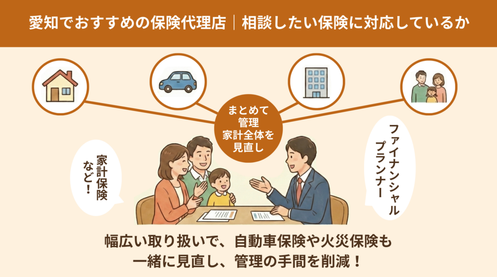 将来的に保険をまとめて管理したい方や、家計全体を見直したい方は、取扱ジャンルが広い代理店の方が便利です。