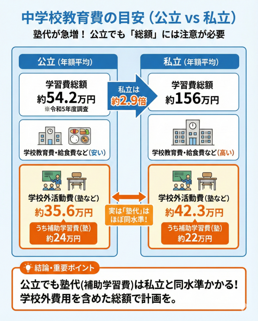 なお、公立中学校でも「補助学習費(塾や家庭教師の費用)」は年間約24万円程度かかっており、実は私立の補助学習費(年間約22万円)とほぼ同水準というデータもあります。