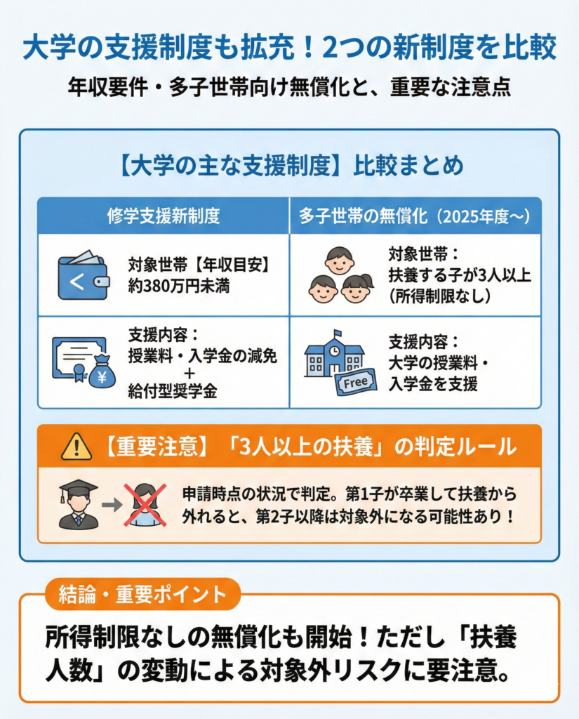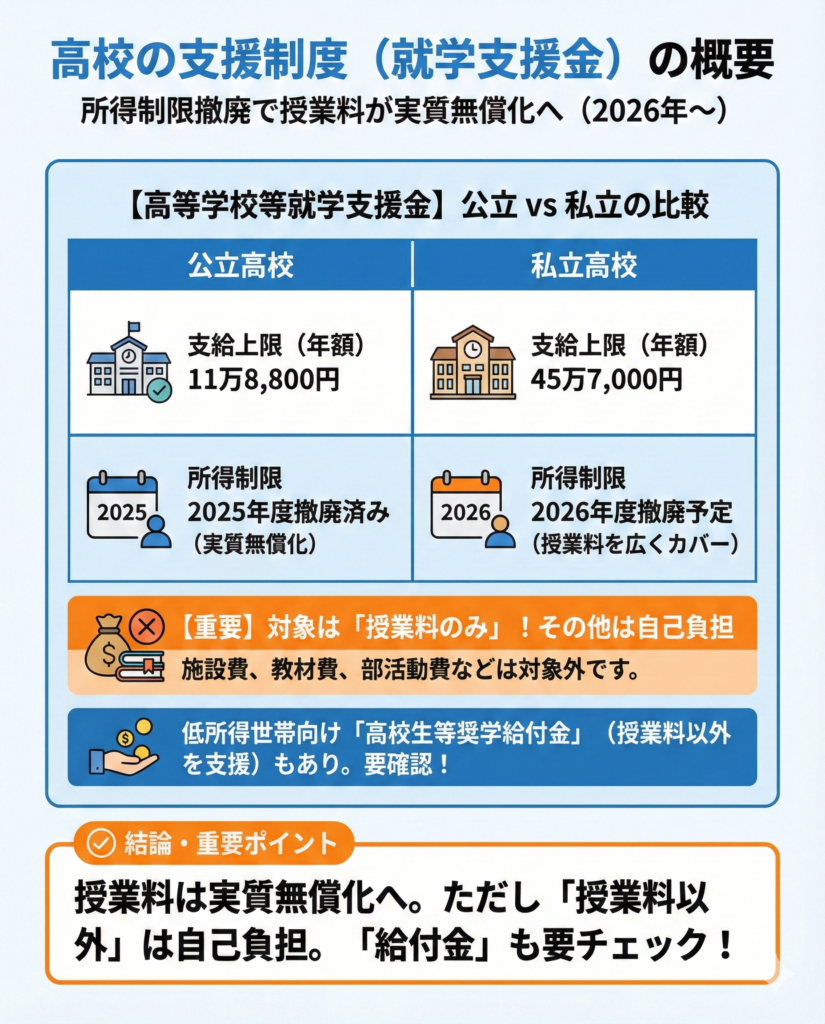 ただし、2025年度から公立高校は所得制限なしで授業料(年間11万8,800円)が実質無償化されています。さらに、2026年度からは私立高校についても所得制限が撤廃され、年間45万7,000円を上限に就学支援金が支給される予定です。