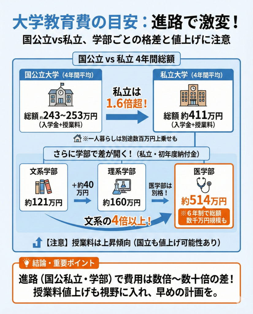 国公立であれば4年間で約240万〜250万円台に収まる一方、私立は約411万円と1.6倍以上の開きがあります。