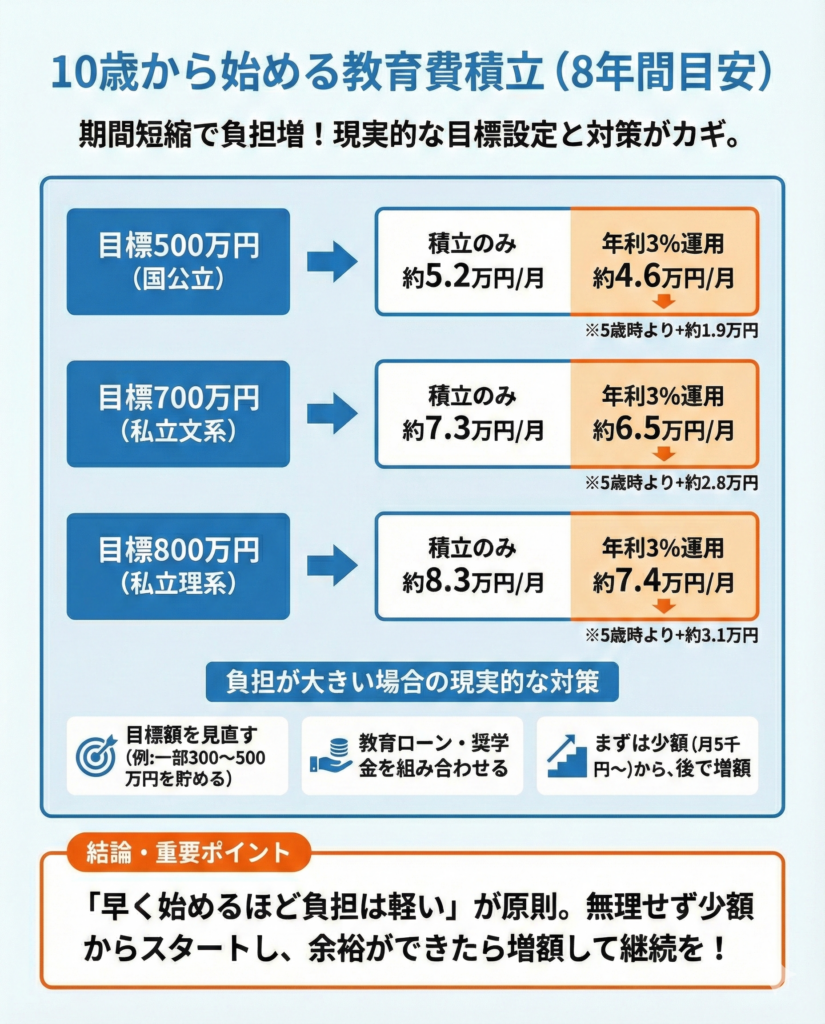 お子さんの年齢別に「毎月いくら積み立てれば間に合うか」をシミュレーションしてみましょう。目標額は以下の3パターンで計算しました。
