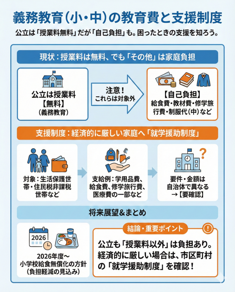 一方、公立は授業料が無償ですが、給食費や学用品費、塾や習い事にかかる費用は発生します。