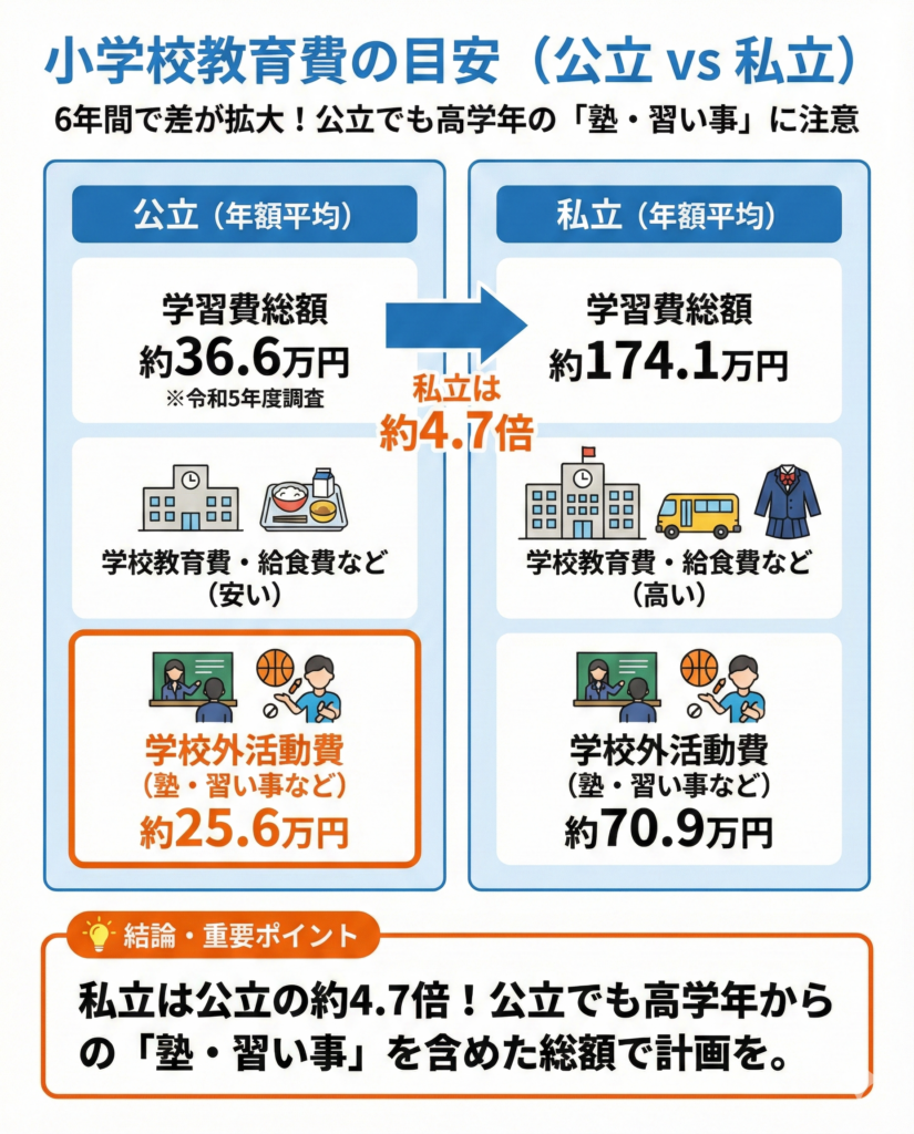 特に高学年になると学習塾費が増える傾向があり、「公立だから安心」とは限りません。