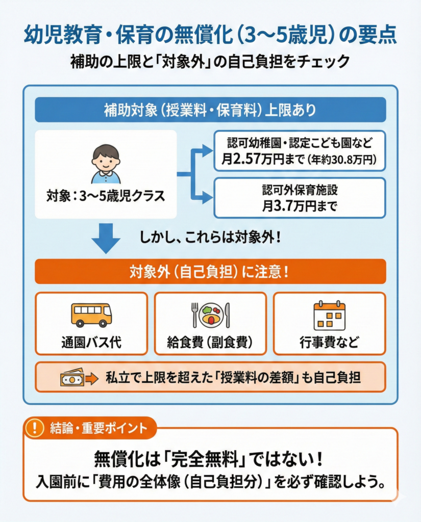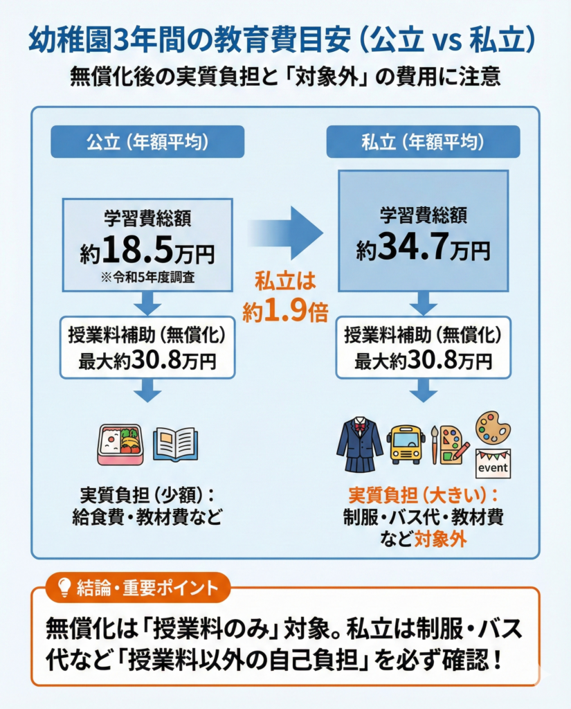 制服代、通園バス代、教材費などは自己負担のままです。私立幼稚園を選ぶ場合は、授業料以外の費用も含めて確認しておくと安心でしょう。