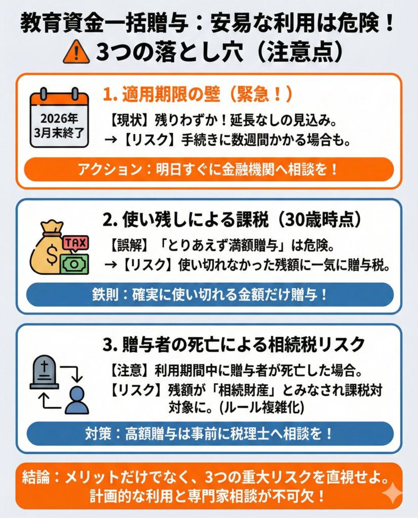 一見メリットばかりに思える制度ですが、この制度には「期限切れ」「使い残し」「相続税への影響」という3つの落とし穴があります。