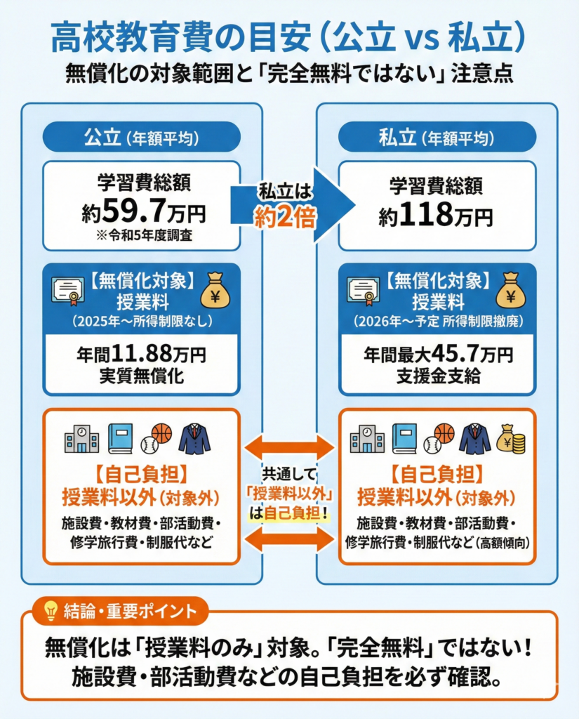 とはいえ、無償化の対象はあくまで授業料です。施設費、教材費、部活動費、修学旅行費、制服代などは自己負担のため、「無償化=完全に無料」ではない点に気をつけてください。