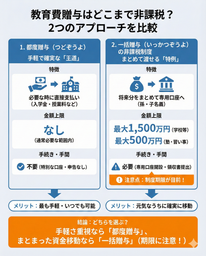 教育費の贈与を非課税で行う方法は、大きく「都度贈与」と「一括贈与の非課税制度」の2つに分かれます。