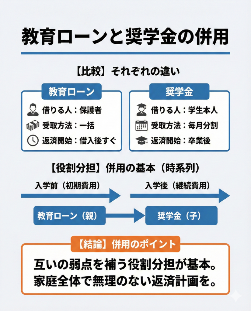 結論からいえば、教育ローンと奨学金は併用できます。むしろ、それぞれの弱点を補い合うために組み合わせて使うのが一般的です。