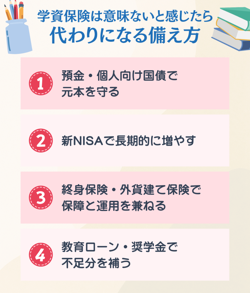 保障と強制力を重視するなら学資保険には確かな価値がありますし、貯蓄性や柔軟性を優先するなら新NISA・国債・教育ローンといった代替策の方が効率的なケースも多くあります。