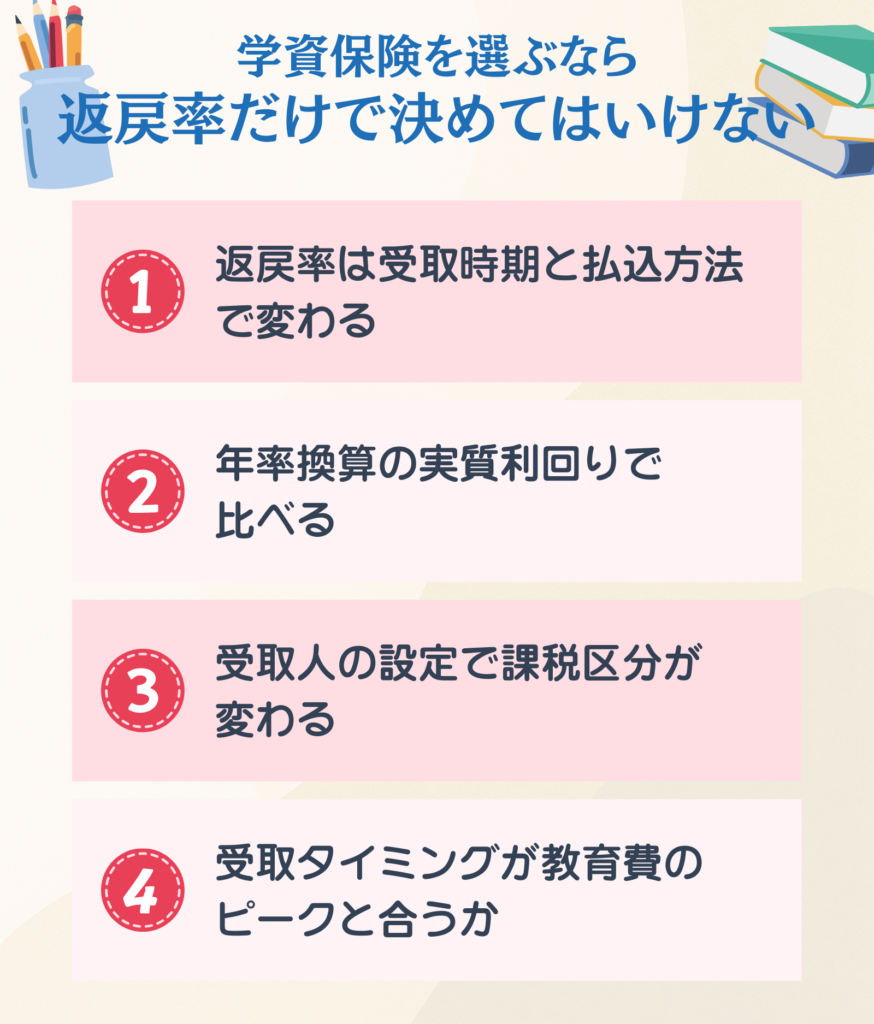 見た目の返戻率だけで判断せず、年率換算・税負担・インフレを含めた「実質的な増え方」で比較する習慣をつけてください。
