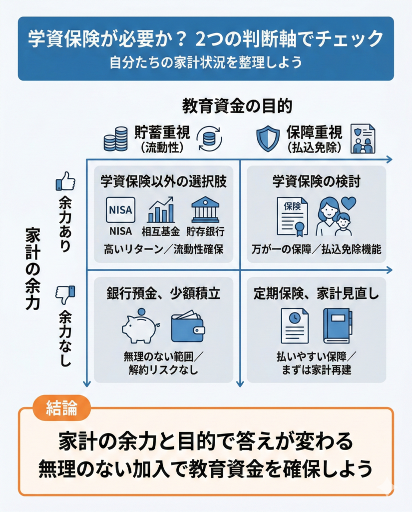 結局のところ入るべきなのか、それとも他の手段の方がいいのか。この問いに対する答えは、家計にどれだけ余力があるか、そして教育資金に「貯蓄」と「保障」のどちらを求めるかによって変わります。