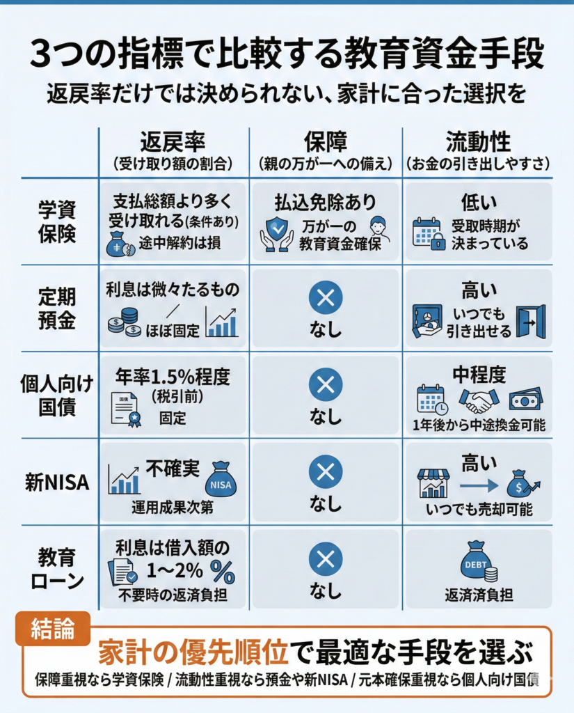保障重視なら学資保険、流動性重視なら新NISAや預金、元本確保重視なら個人向け国債と、家計に合った選択肢が見えてきます。