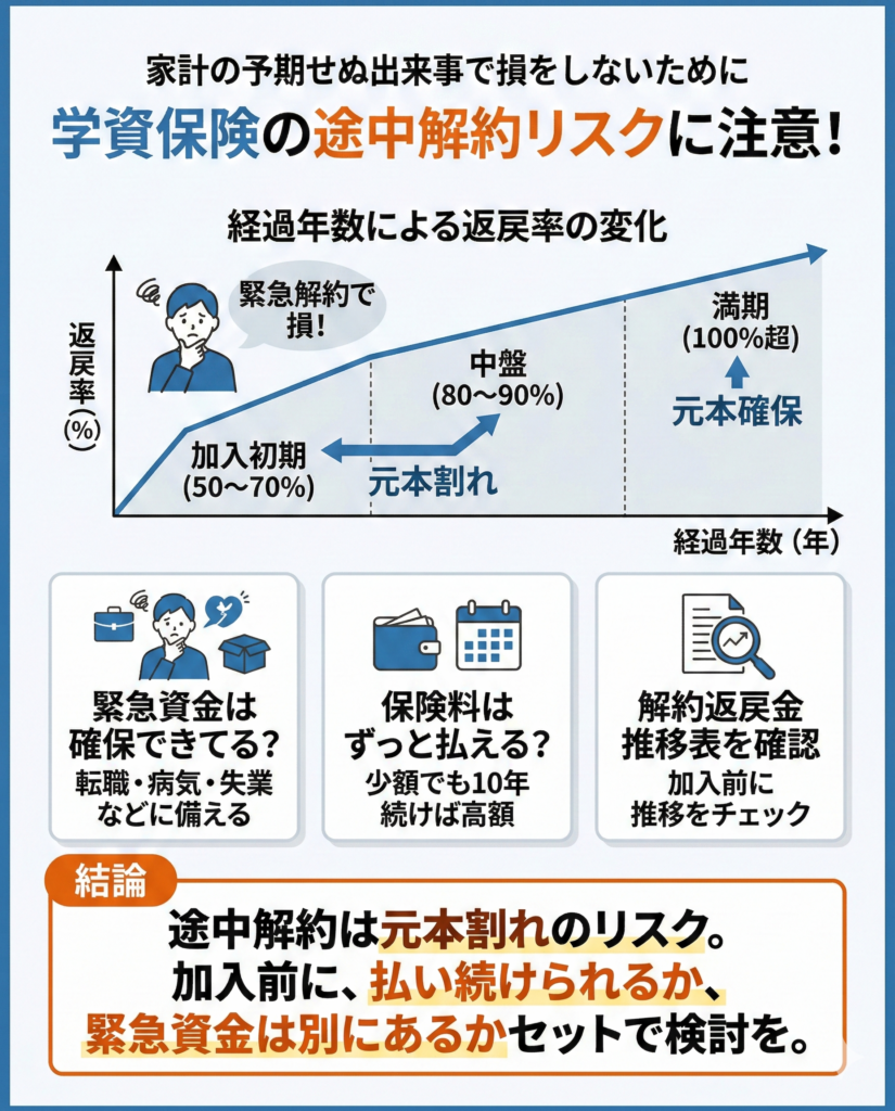 学資保険は長期の保険契約です。家計が苦しくなって途中で解約すると、受け取れる解約返戻金は支払った保険料を下回る可能性が高くなります。