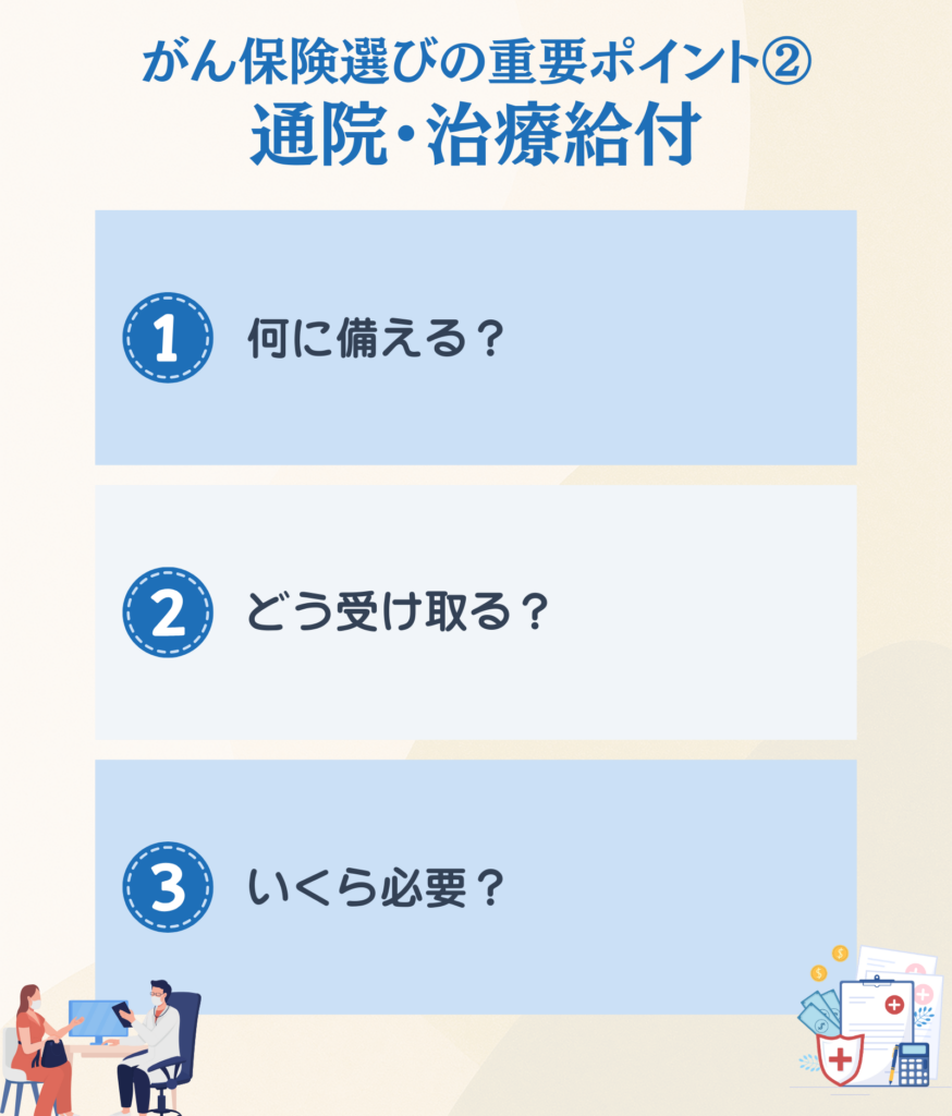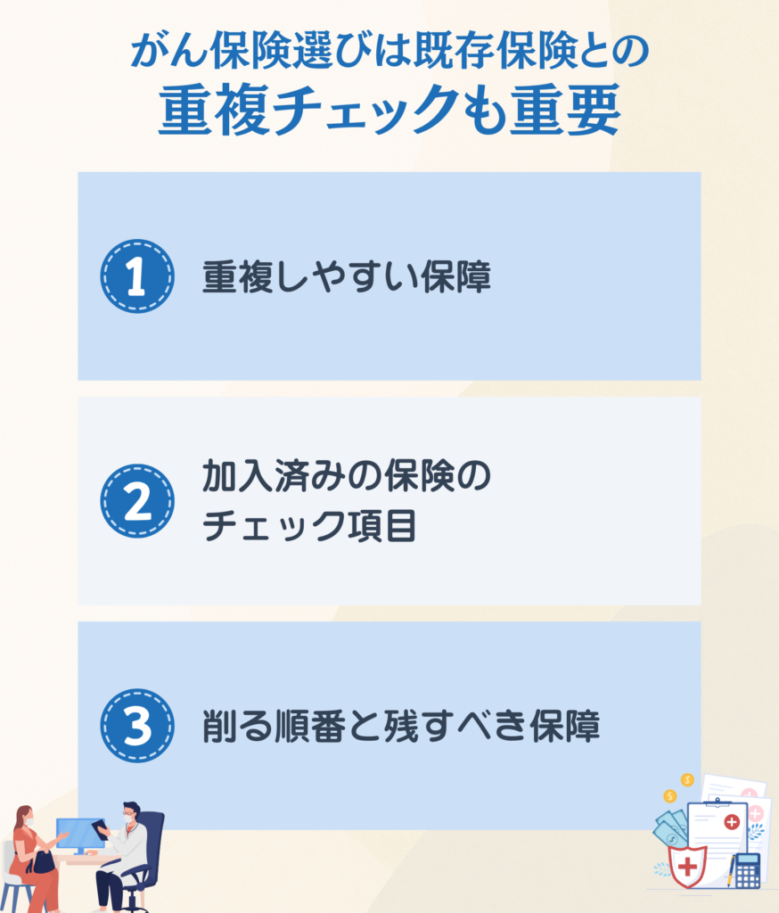 そのうえで、既契約の保険と重複しない形で、診断一時金→治療・通院給付→先進医療の順に保障を組み立てていきます。