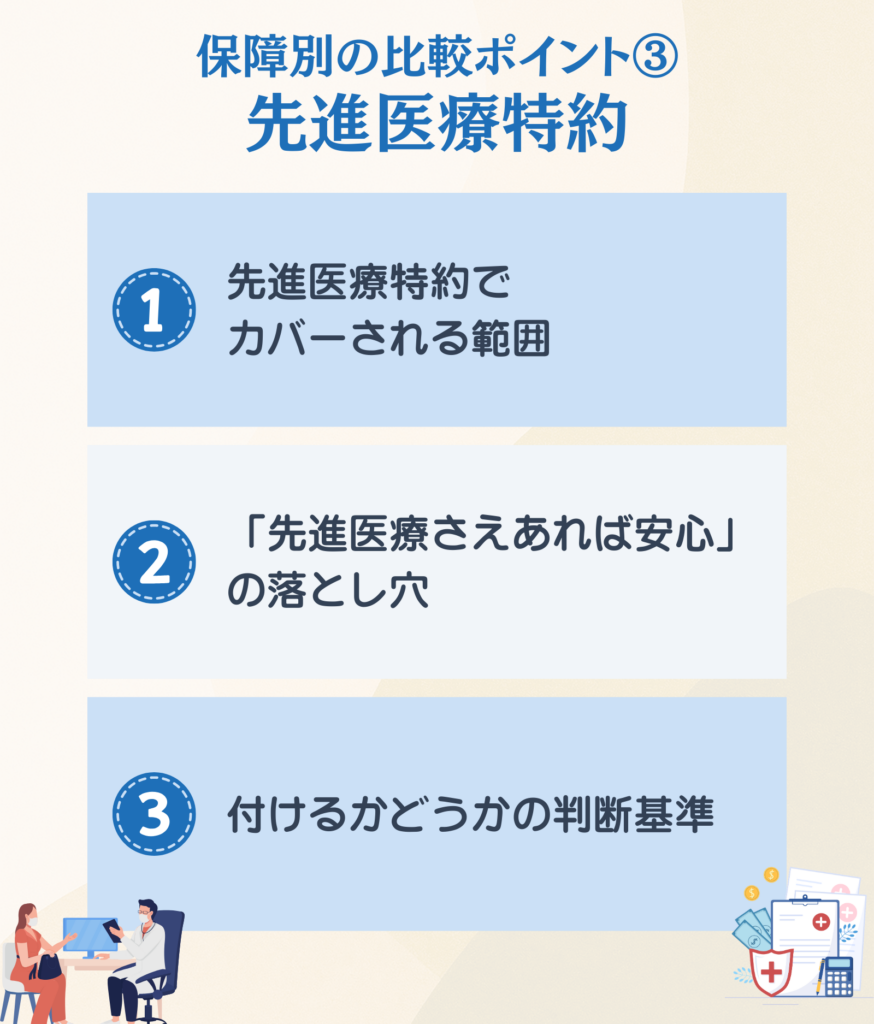 詳しい判断基準は、後半の「保障別の比較ポイント③:先進医療特約」で解説します。