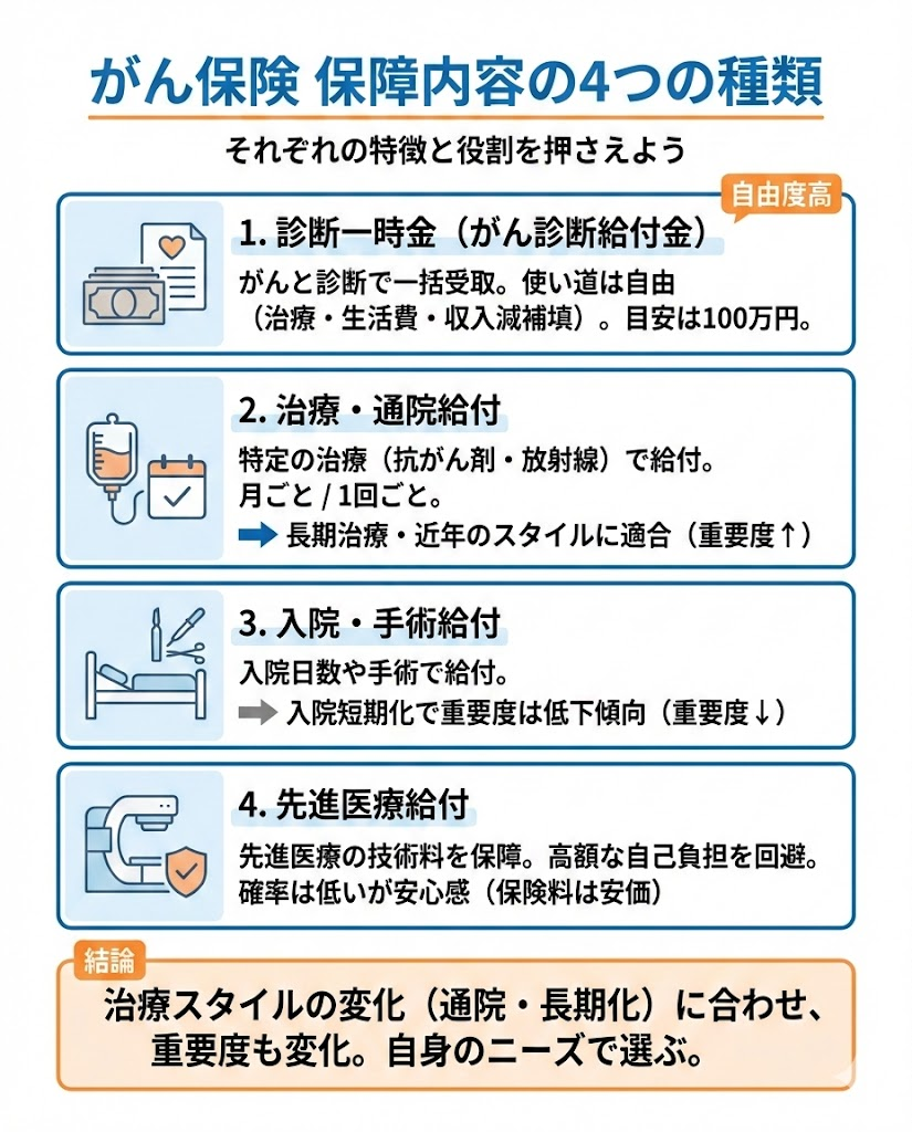 がん保険の保障は、大きく4つに分けられます。