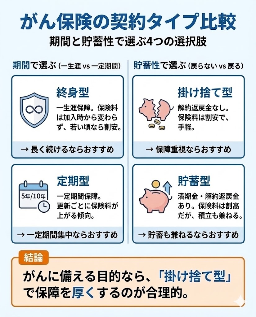 がん保険の契約タイプは、「期間」と「貯蓄性」で分類できます。