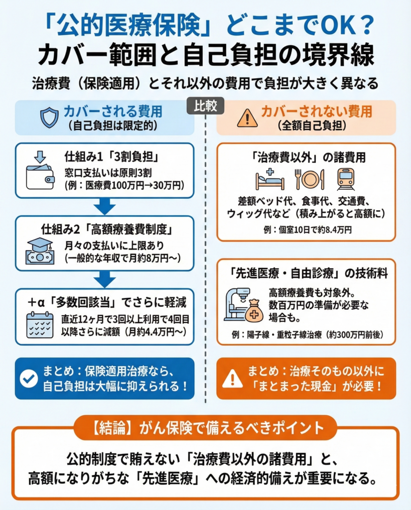 がん保険を検討するとき、まず知っておきたいのが「公的医療保険でどこまでカバーされるか」です。