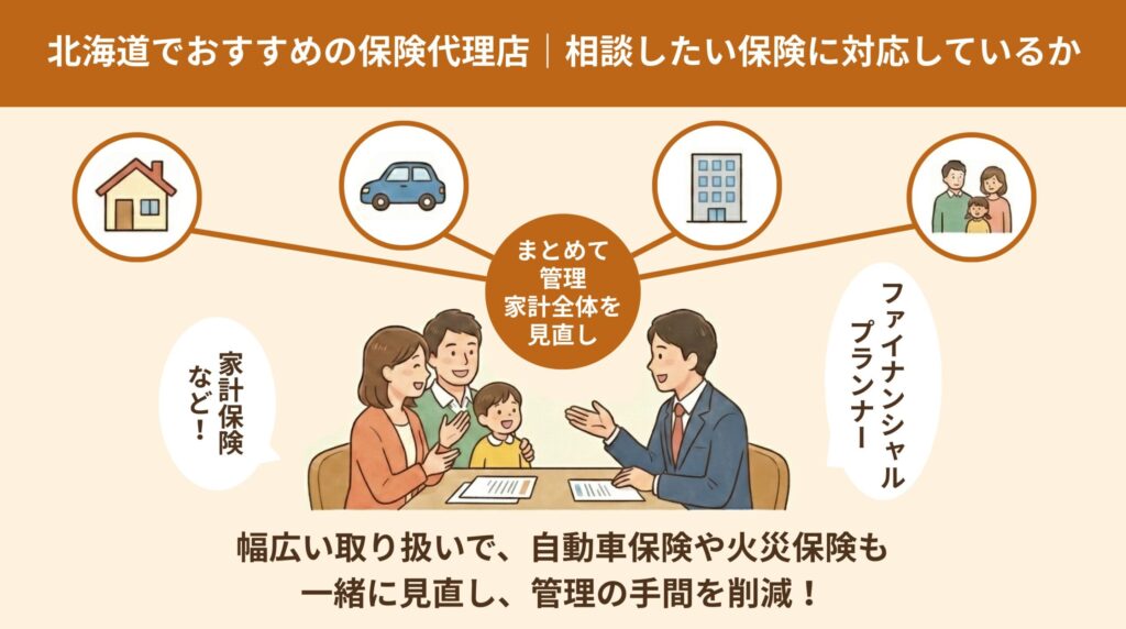 将来的に保険をまとめて管理したい方や、家計全体を見直したい方は、取扱ジャンルが広い代理店の方が便利です。