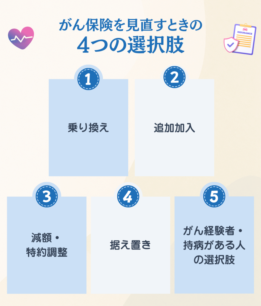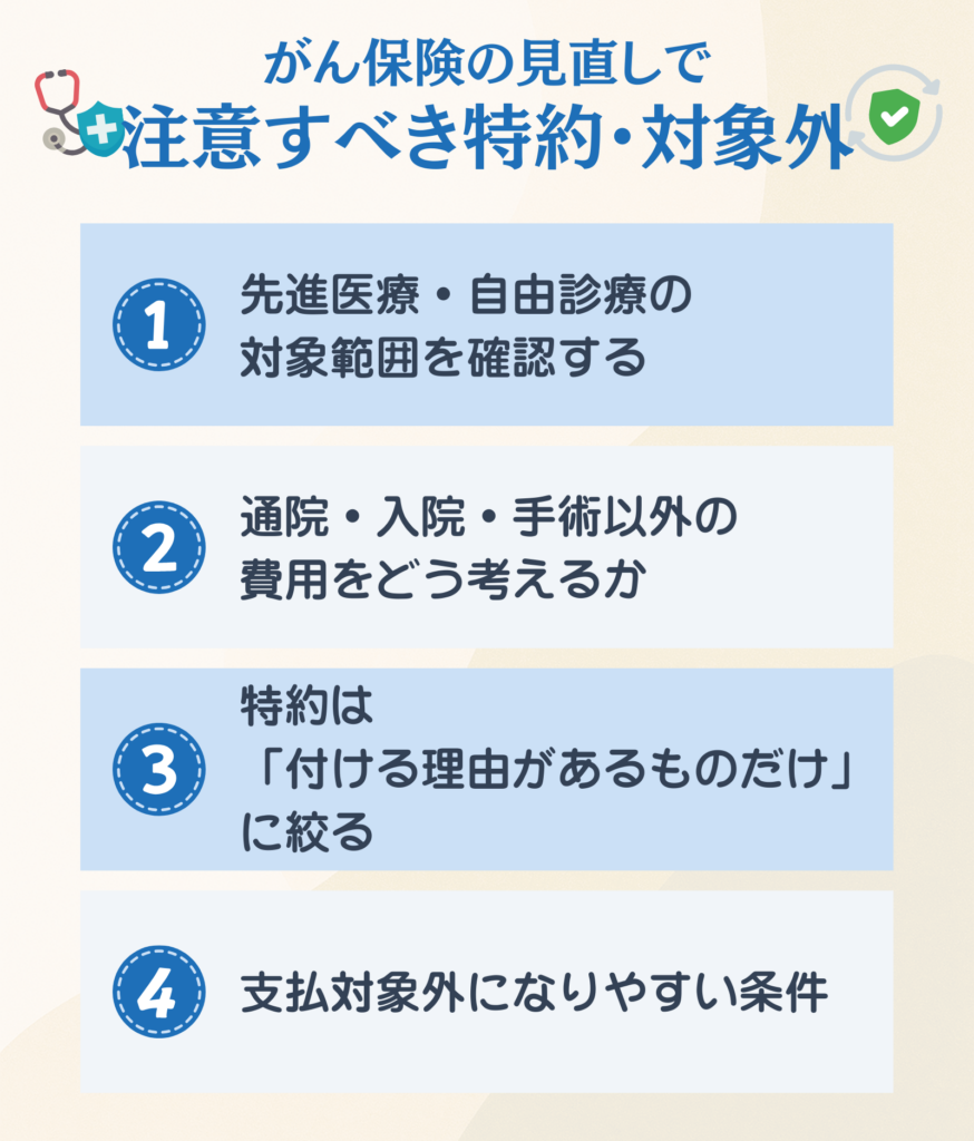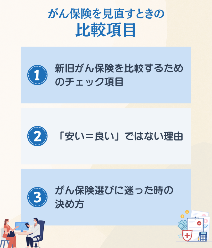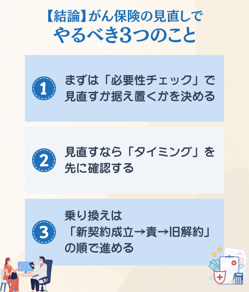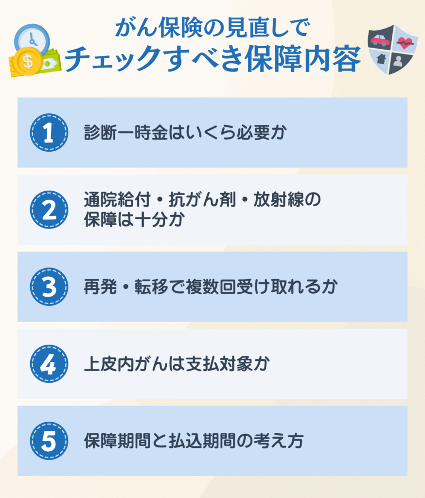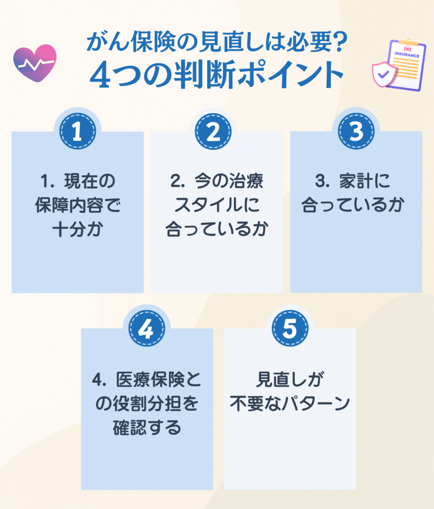 保障内容、治療スタイルへの適合、家計とのバランス、医療保険との役割分担、この4つのポイントをチェックすれば、見直しの必要性が判断できます。