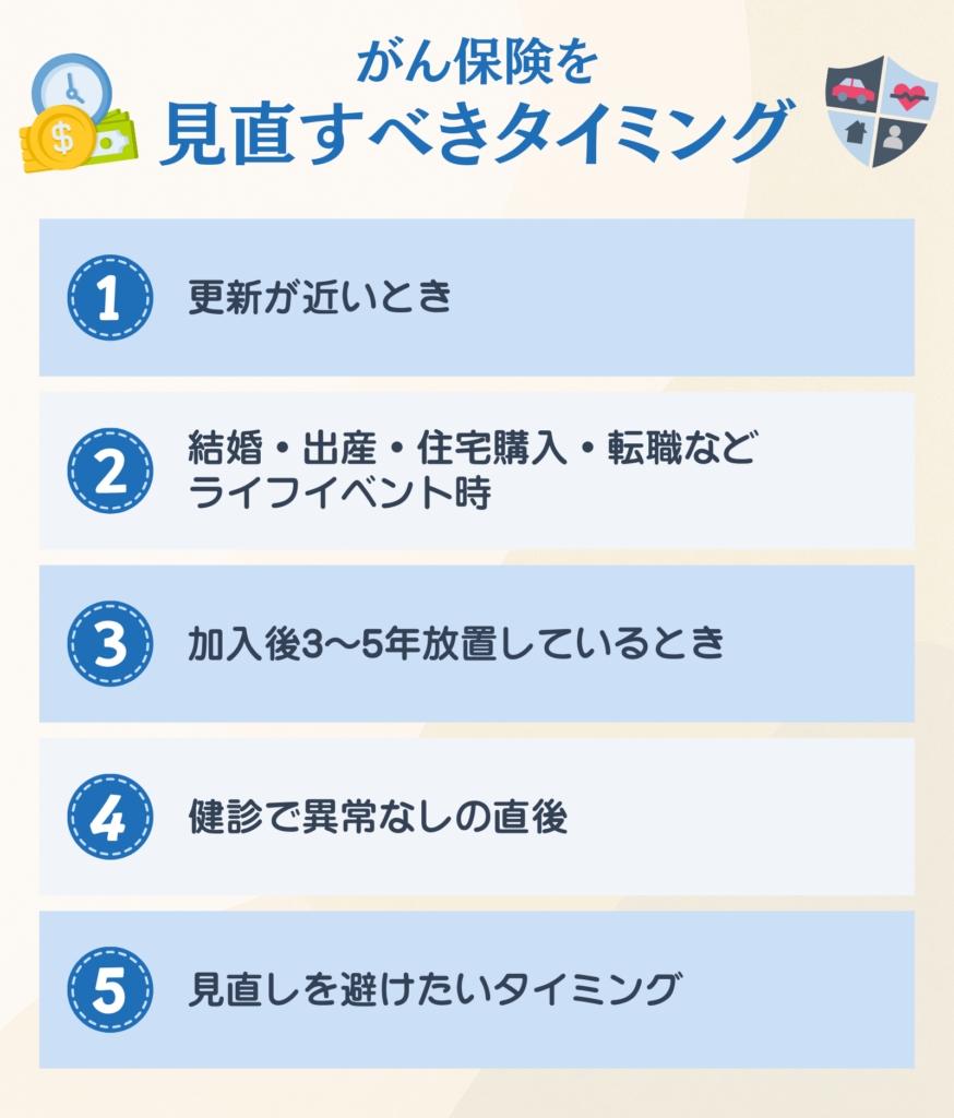 具体的なタイミングについては、後ほど「がん保険を見直すべきタイミング」の章で詳しく解説します。