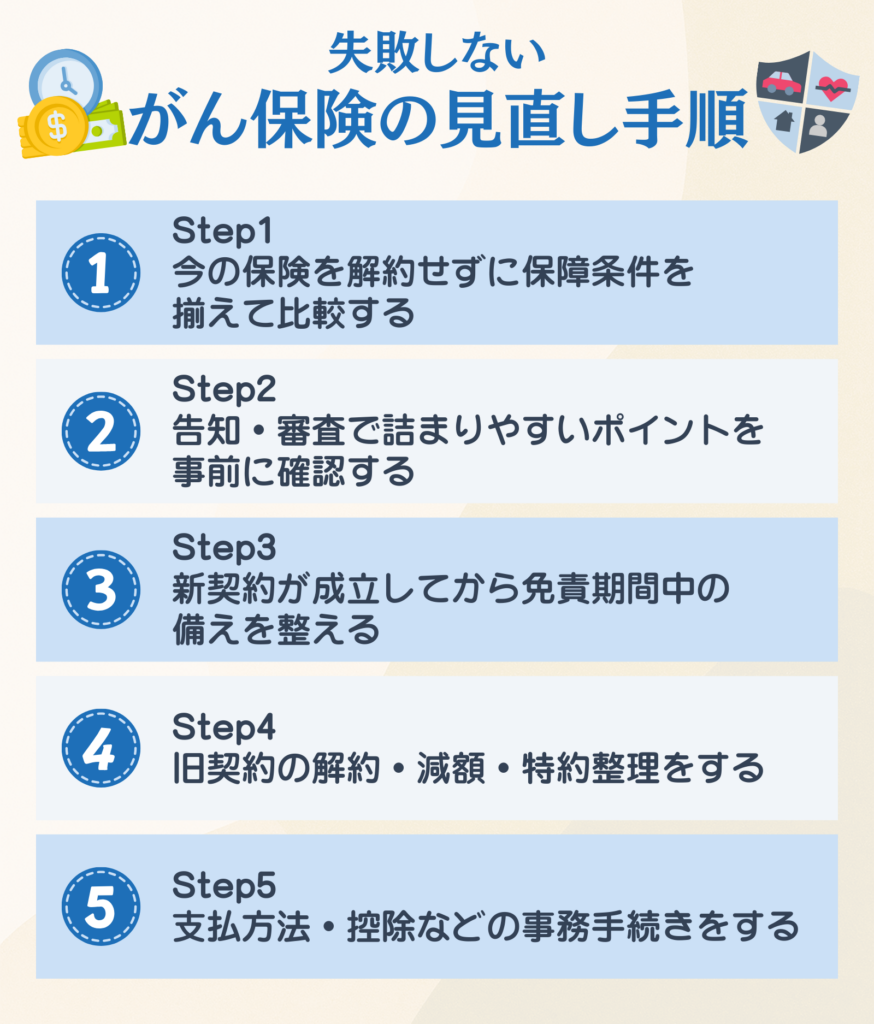 見直しを進める際は、乗り換え・追加・減額といった選択肢の中から自分に合った方法を選び、「新契約成立→免責期間経過→旧契約解約」の順番を守ることが大切です。保障の空白期間さえ作らなければ、安心して乗り換えられます。
