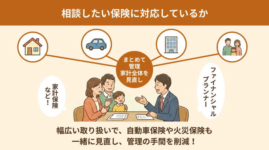 将来的に保険をまとめて管理したい方や、家計全体を見直したい方は、取扱ジャンルが広い代理店の方が便利です。