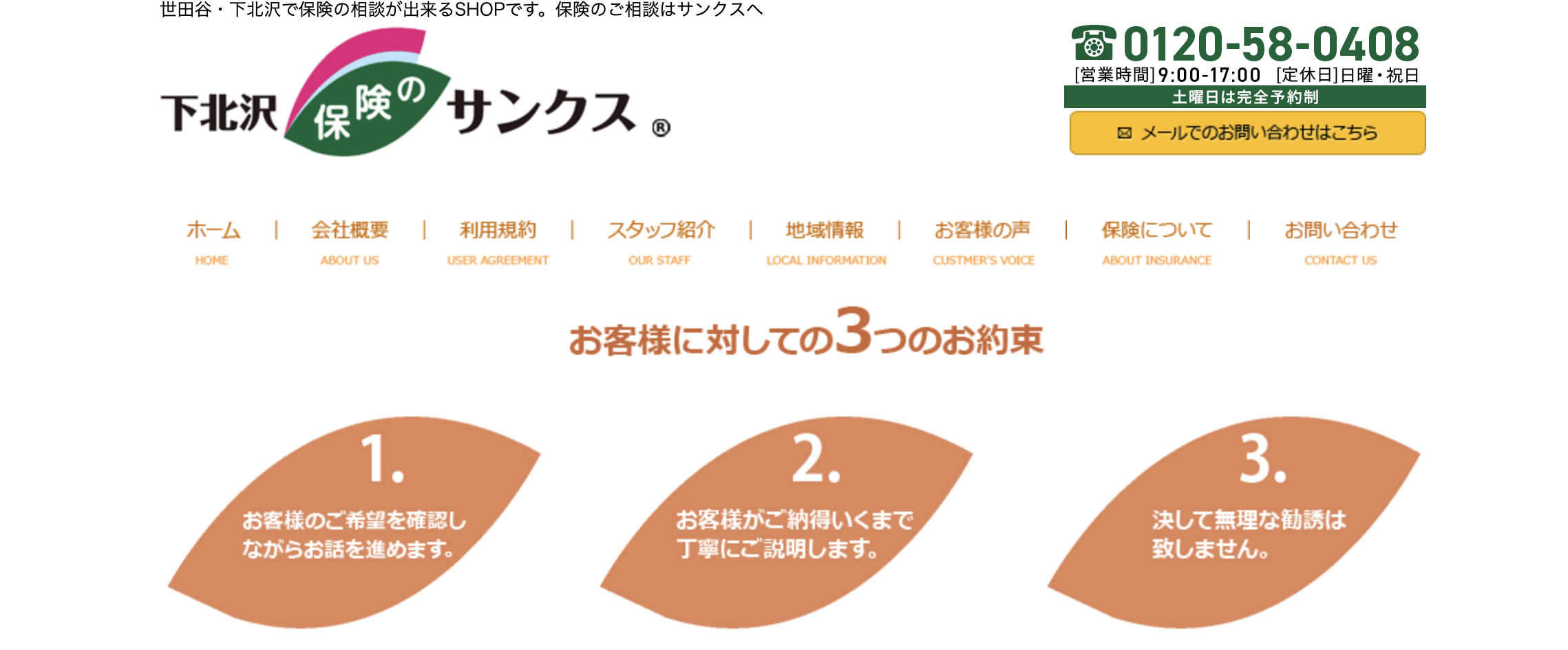 | 下北沢 保険のサンクス (運営:株式会社サンクス) | 東京都世田谷区北沢1-39-9 1F~2F | ー | 対面(来店) 電話 メール LINE | 生命保険 損害保険 | 9:00~18:00(定休:日祝) |