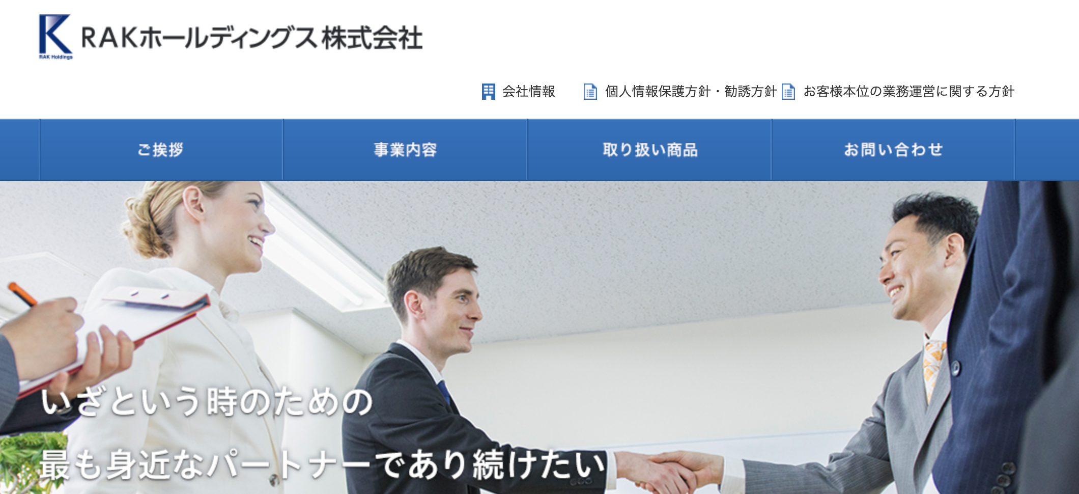 | RAKホールディングス株式会社 | 東京都千代田区麹町2-6-7 麹町R・Kビル | 22社(引受保険会社) | 対面 電話 Webフォーム | 生命保険 損害保険 年金・資産運用 法人向けコンサル | 9:00~18:00(土日、祝祭日休) |
