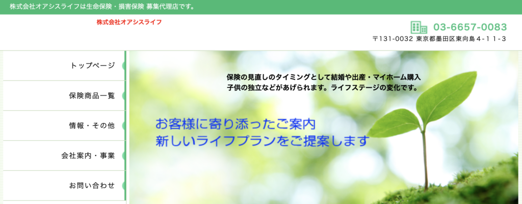 | 株式会社オアシスライフ | 東京都墨田区東向島4-11-3 | 生命保険:3社 損害保険:1社 | 対面・WEB等 | 生命保険/損害保険/法人向け/個人向け | 10時〜17時 |