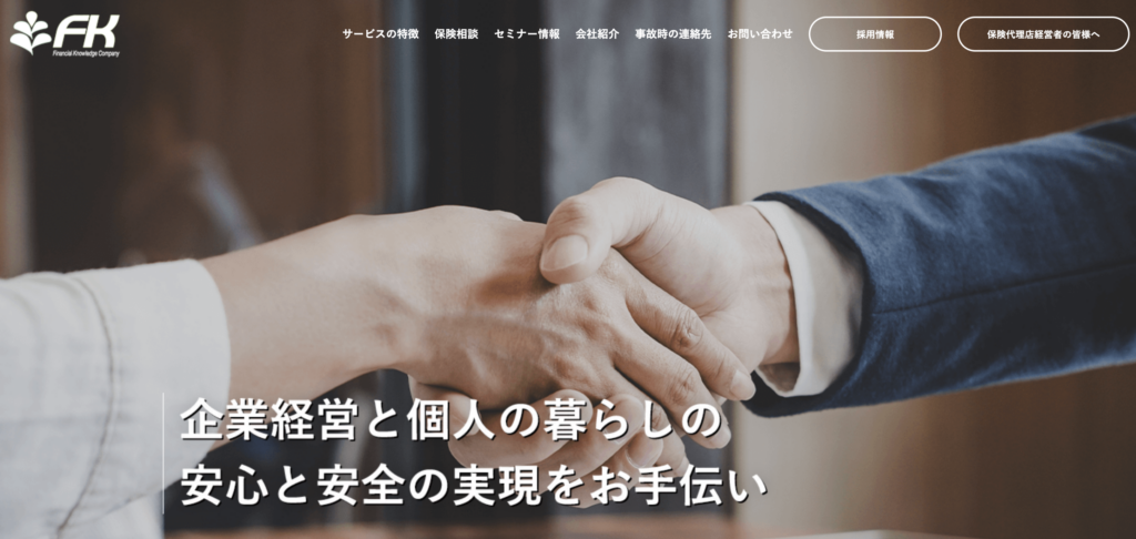 生命保険・損害保険の両方に加えて、企業向けリスクマネジメント、個人向けファイナンシャルプランニングまで事業内容として掲げる総合型代理店です。営業時間が9〜19時(日祝除く)と長めで、平日夜に相談したい会社員や経営者にも相性が良い設計。取扱保険会社の一覧も公開されており、法人の賠償責任や事業リスクから個人の医療・死亡保障まで、テーマ横断で相談したい人に向きます。