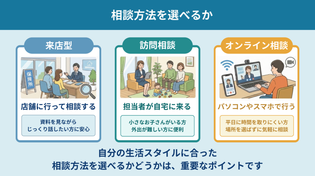小さなお子さんがいる方や、平日に時間を取りにくい方には、訪問やオンライン対応がある窓口が便利です。一方で、資料を見ながらじっくり話したい方は、店舗型の方が安心できる場合もあります。