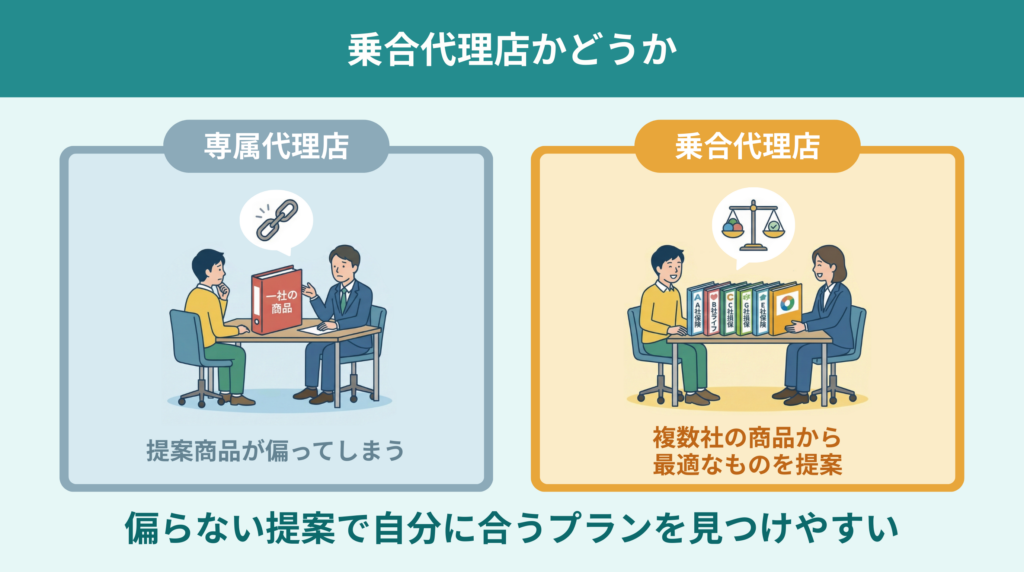 まず確認したいのは、複数の保険会社を扱う乗合代理店かどうかです。